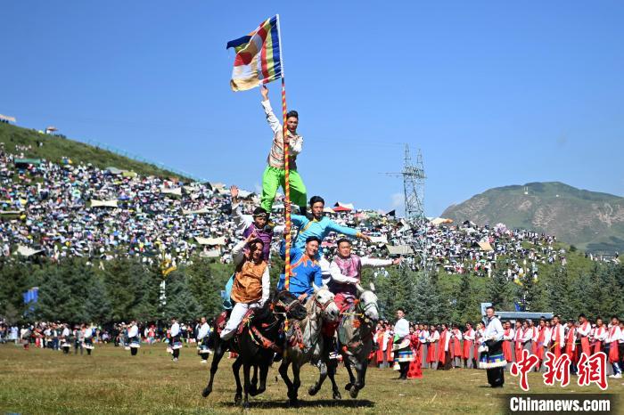8月4日,藏族騎手在當(dāng)周草原上表演馬隊(duì)巡游。中新社記者 九美旦增 攝