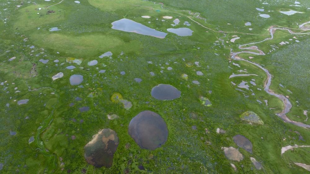 這是7月23日在長(zhǎng)江南源拍攝的查旦濕地(無(wú)人機(jī)照片)。新華社 潘彬彬 攝