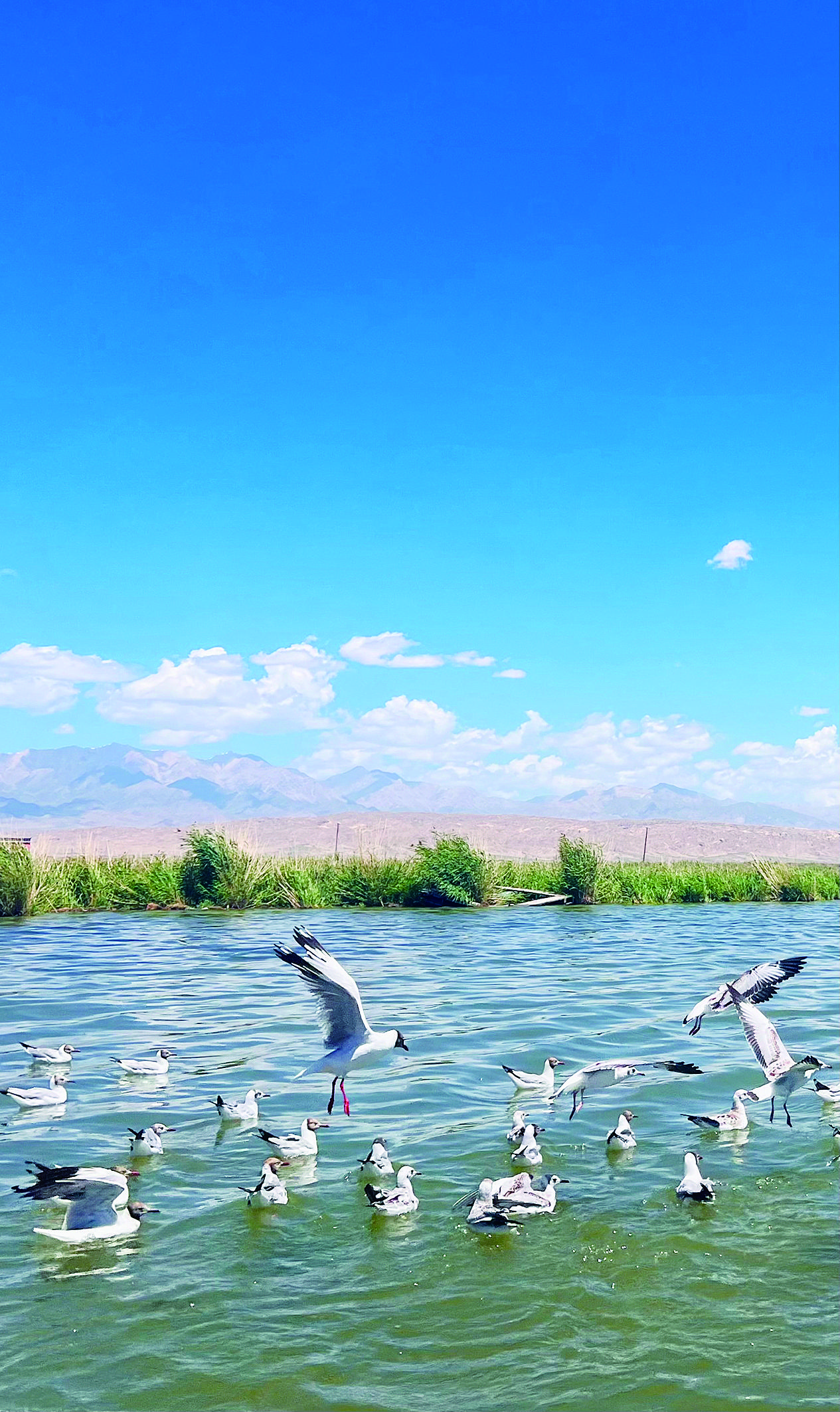 來到可魯克湖旅游景區(qū)。水清草茂,景色旖旎,候鳥云集。成群結(jié)隊(duì)的鳥兒有的悠然靜臥于蘆葦叢中,有的在水面歡快輕盈地翻飛,游客行走在湖畔,與紅嘴鷗親密互動(dòng),感受著大自然的神奇魅力。