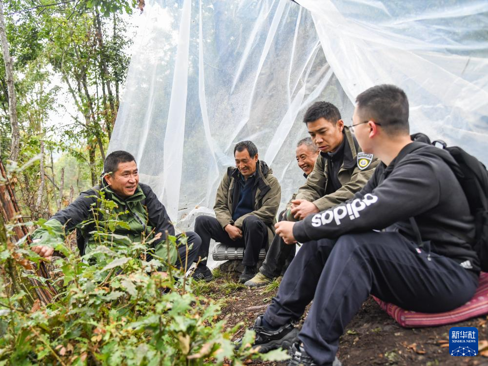 在四川白河國家級(jí)自然保護(hù)區(qū),唐玉林(左一)和巡護(hù)隊(duì)員一起在搭建的簡易塑料蓬內(nèi)短暫休息交流(10月11日攝)。新華社記者 王曦 攝