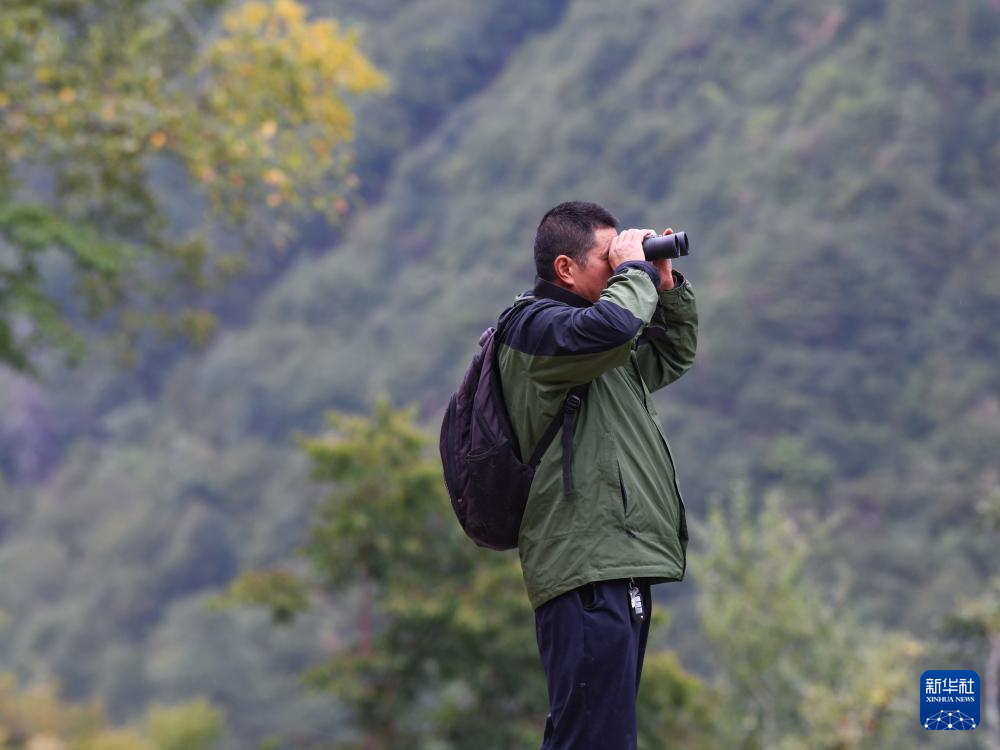 在四川白河國家級(jí)自然保護(hù)區(qū),唐玉林使用望遠(yuǎn)鏡觀察保護(hù)區(qū)森林防火情況(10月11日攝)。新華社記者 王曦 攝