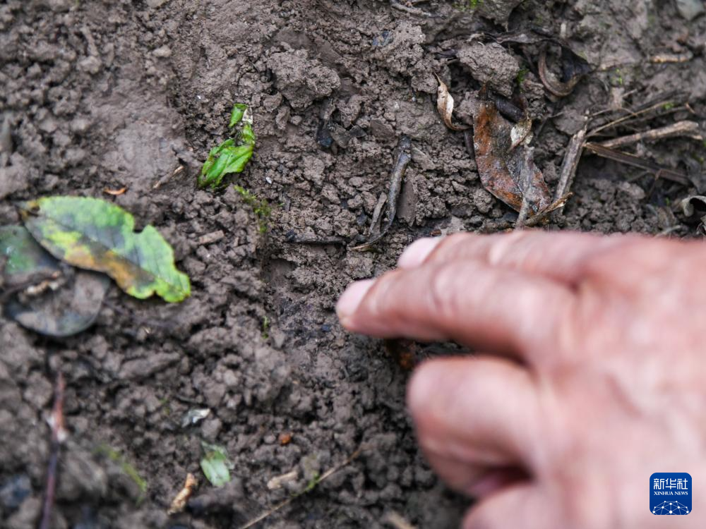 在四川白河國家級(jí)自然保護(hù)區(qū),唐玉林在巡護(hù)路上發(fā)現(xiàn)毛冠鹿的腳印(10月11日攝)。新華社記者 王曦 攝