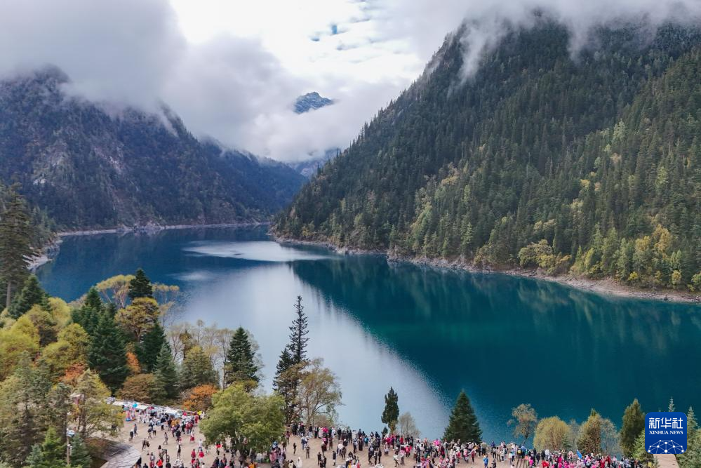 10月10日,游客在九寨溝景區(qū)長海游覽觀光(無人機(jī)照片)。新華社記者 王曦 攝