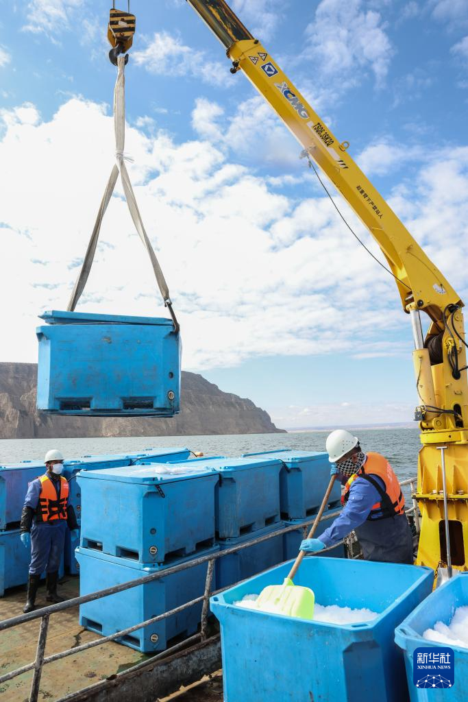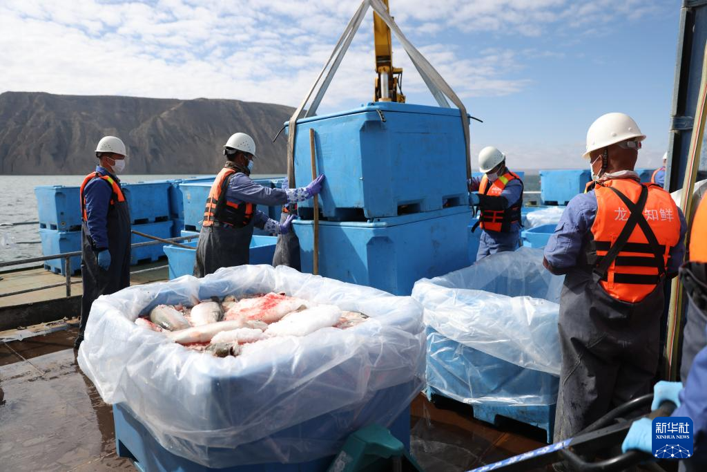 10月18日,龍洋知鮮(青海)股份有限公司員工吊裝冷水魚。新華社記者 呂帥 攝