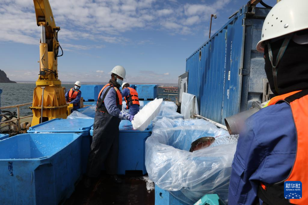 10月18日,龍洋知鮮(青海)股份有限公司員工給冷水魚加冰塊保鮮。新華社記者 呂帥 攝