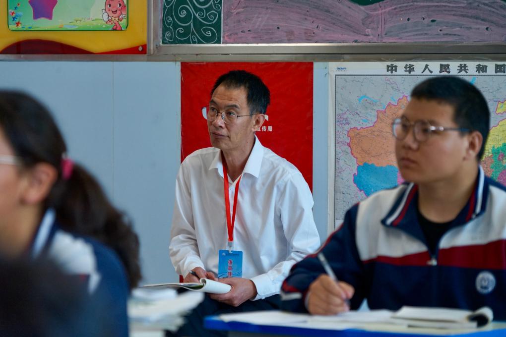 上海援青干部、果洛西寧民族中學(xué)校長常途在課堂旁聽。新華社記者 張子琪 攝