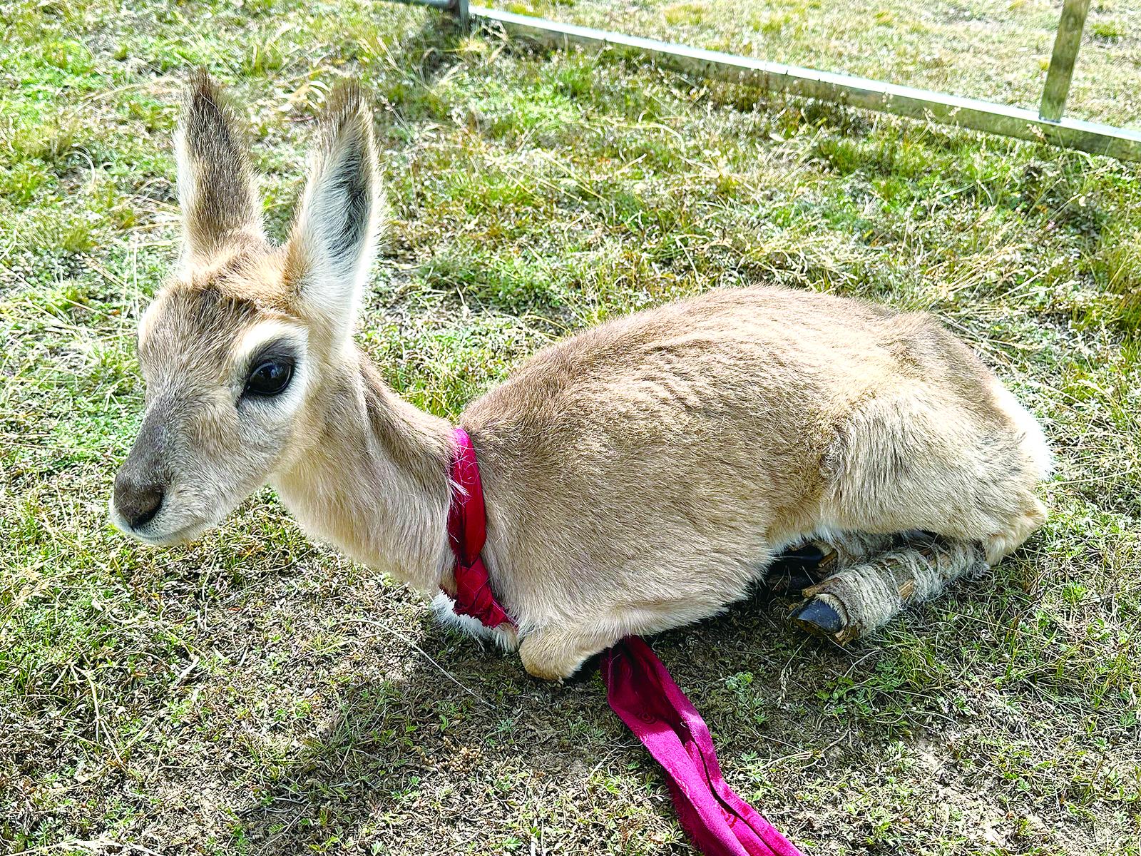 本強和加羊多杰一路小跑,臨近,才看清是一只受傷的藏原羚。藏原羚靜靜地趴在草地上,看到有人靠近,掙扎著想要爬起來,嘗試了幾次沒能成功。