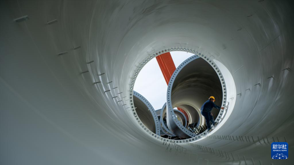 青海華匯新能源有限公司塔筒車間工人在檢查塔筒(10月10日攝)。新華社發(fā)(潘彬彬 攝)