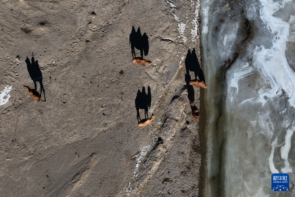 11月27日,在青海省海西蒙古族藏族自治州烏蘭縣,幾只駱駝?wù)谛蓓o人機(jī)照片)。新華社記者 張龍 攝