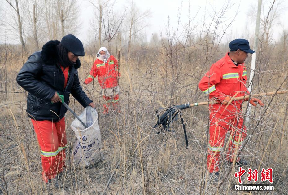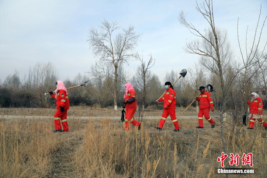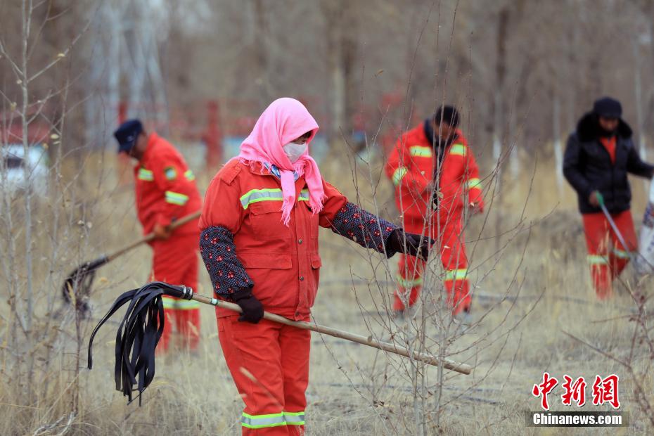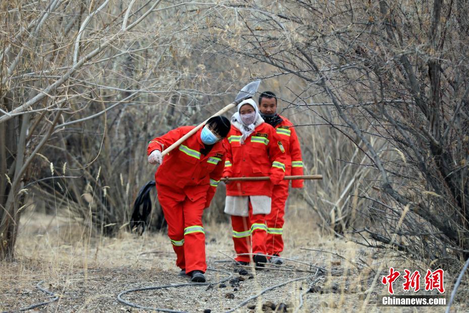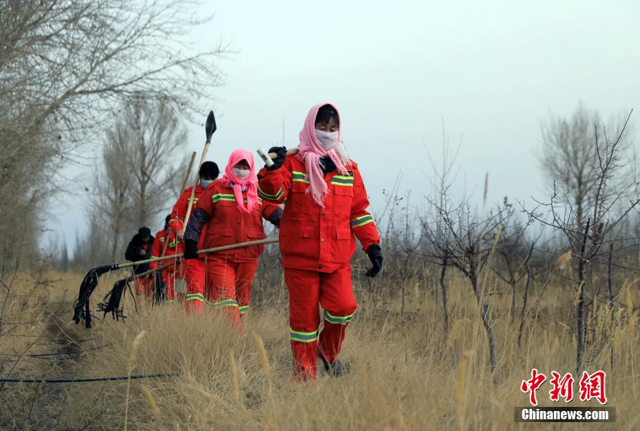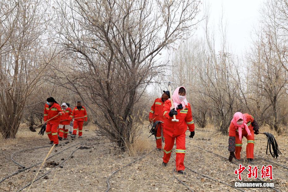 12月9日,護(hù)林員在千畝林中心林地整理澆灌的水管線。中新社記者 王磊 攝