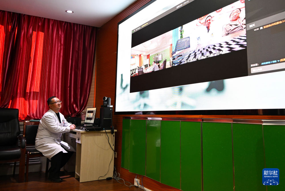 12月17日,在青海省海南藏族自治州共和縣中醫(yī)院,醫(yī)生穆連財(cái)在與鄉(xiāng)鎮(zhèn)衛(wèi)生院連線進(jìn)行遠(yuǎn)程會診。新華社記者 張龍 攝