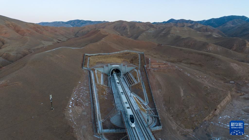 1月14日8時20分許,蘭州西發(fā)往武威東的D8885次動車組列車穿過新烏鞘嶺隧道(無人機(jī)照片)。新華社記者 郎兵兵 攝
