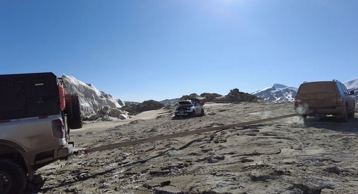 可可西里巡山隊(duì)隊(duì)員在巡山過(guò)程中用拖車?yán)K拉出被困車輛(2025年1月14日攝)。新華社發(fā)(杜笑微攝)