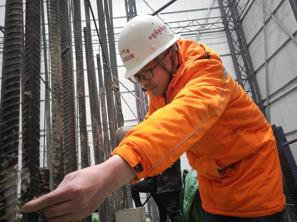 隧道外的橋梁也正在同步施工,項(xiàng)目部副經(jīng)理王海剛和同事負(fù)責(zé)橋墩的澆筑工作,他們每半個(gè)小時(shí)就要檢查橋墩周?chē)臏囟?,確保橋墩周?chē)鷾囟仍?0攝氏度以上。