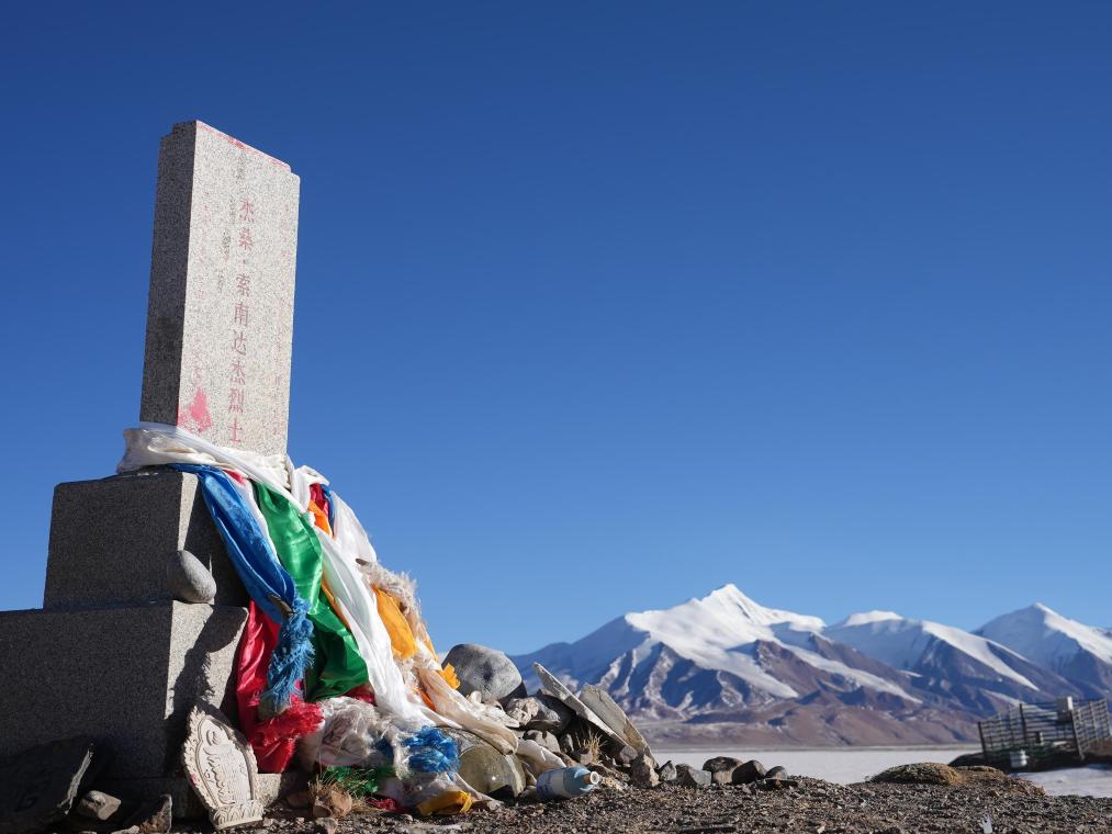 這是可可西里無人區(qū)腹地太陽湖湖邊索南達(dá)杰烈士紀(jì)念碑,索南達(dá)杰犧牲在太陽湖,他的骨灰也撒在太陽湖(攝于2025年1月14日)。新華社發(fā)