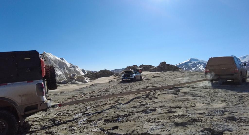 可可西里巡山隊隊員在巡山過程中用拖車?yán)K拉出被困車輛(2025年1月14日攝)新華社發(fā)