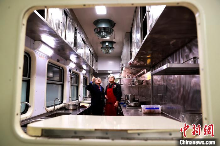 圖為郝寶君和餐車工作人員查看餐車設(shè)備運行情況。薛蒂 攝