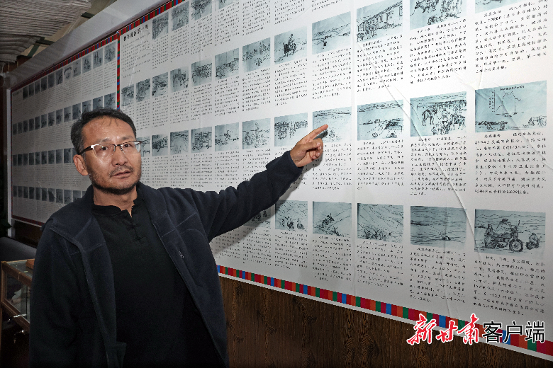 王團勝站在父親王萬青所繪連環(huán)畫前,追憶父親生前往事。新甘肅·甘肅日報記者 田蹊