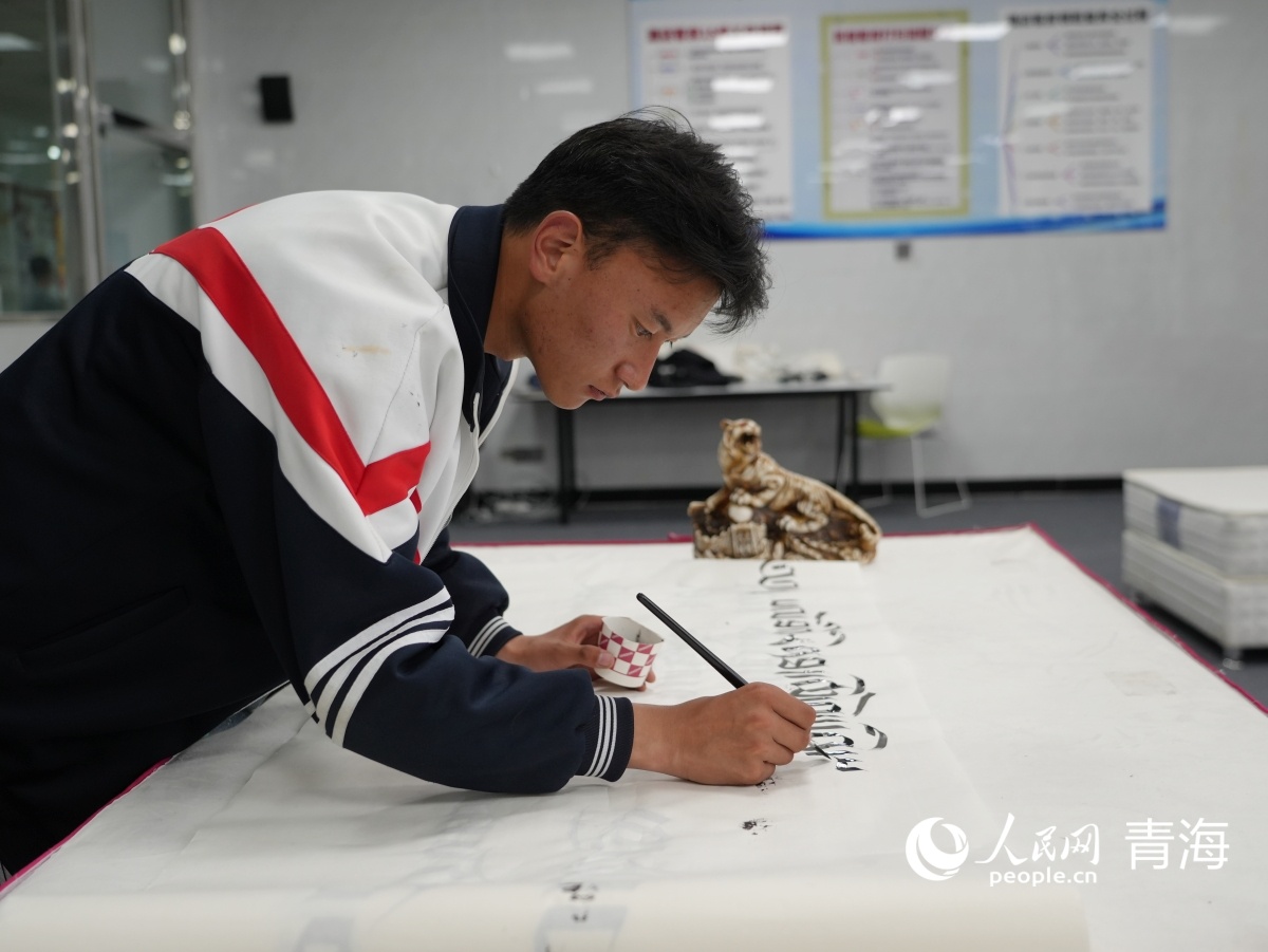 高星級飯店運營與管理專業(yè)學生展示德昂灑智書法技藝。人民網(wǎng)記者 楊啟紅 攝