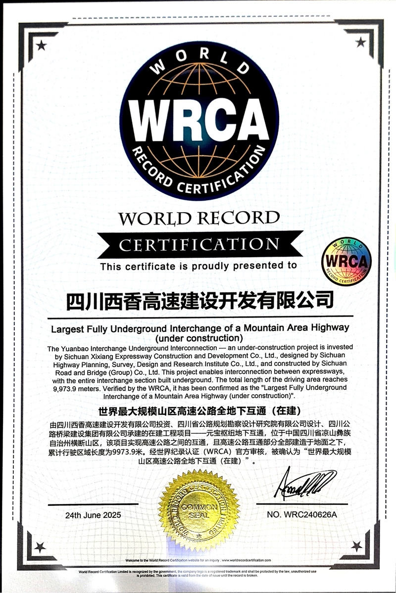 日前,西香高速公路元寶樞紐地下互通,被WRCA(世界紀(jì)錄認(rèn)證公司/機構(gòu))認(rèn)證為“世界最大規(guī)模山區(qū)高速公路全地下互通(在建)”。WRCA是全球包括中國唯一獲批相關(guān)世界紀(jì)錄認(rèn)證商標(biāo)的機構(gòu)。