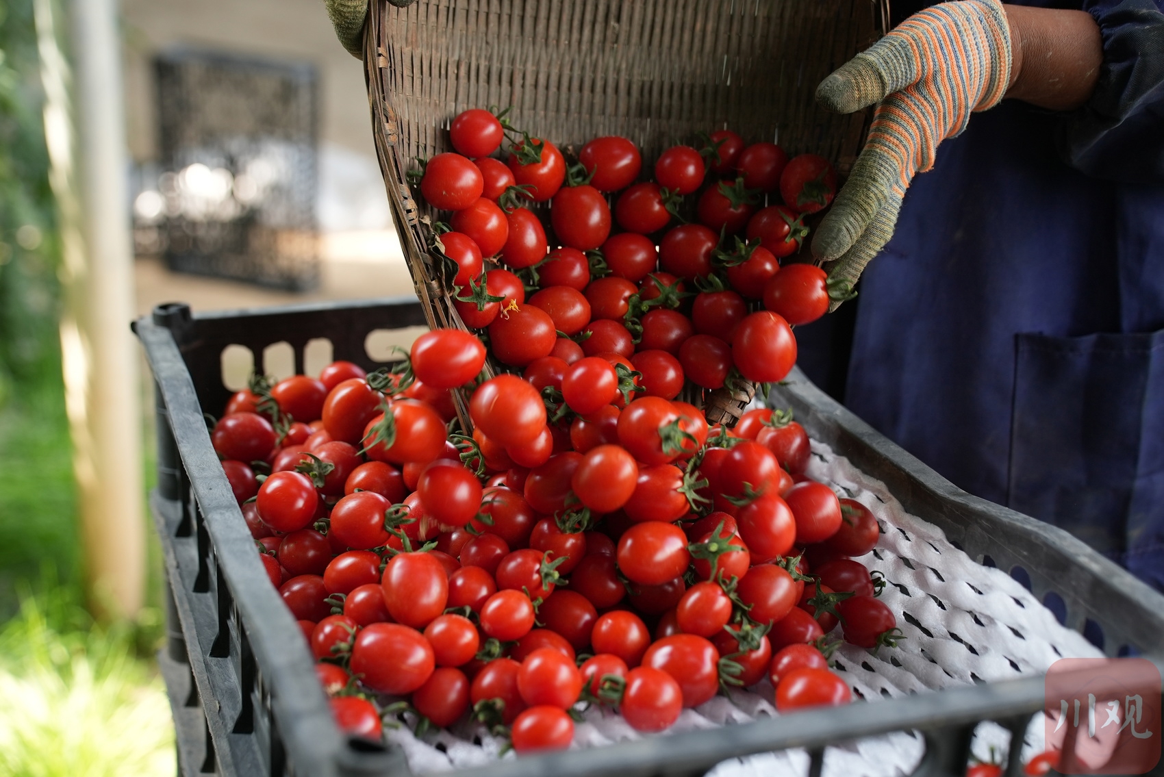 工人將新采摘的高原水果小番茄裝框。