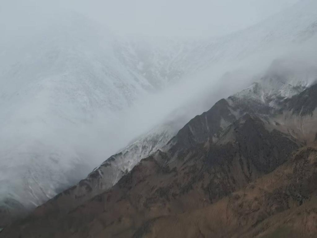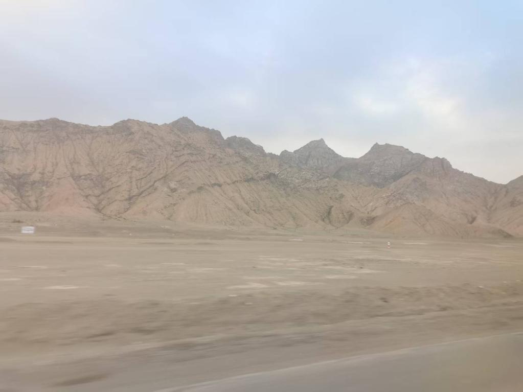 半個小時之后,風(fēng)勢在幾滴雨點(diǎn)的打擊下,漸漸緩和下來。當(dāng)沙幕隱去,露出被磨洗過的藍(lán)天時,我們都長舒了一口氣。擋風(fēng)玻璃上的兩側(cè),裹了厚厚一層泥巴。遠(yuǎn)處的山峰頂上,白雪在太陽的余暉下,染成了金黃。