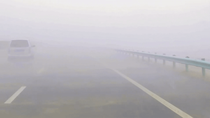 汽車像得了瘧疾,隨著狂風(fēng)一陣陣打擺子。整個公路都被黃色吞沒,只剩下模模糊糊的白色車道線。司機(jī)躬著身子,像趴在方向盤上一樣,瞪著眼睛盯著前方,頭快要抵到前風(fēng)擋玻璃了。