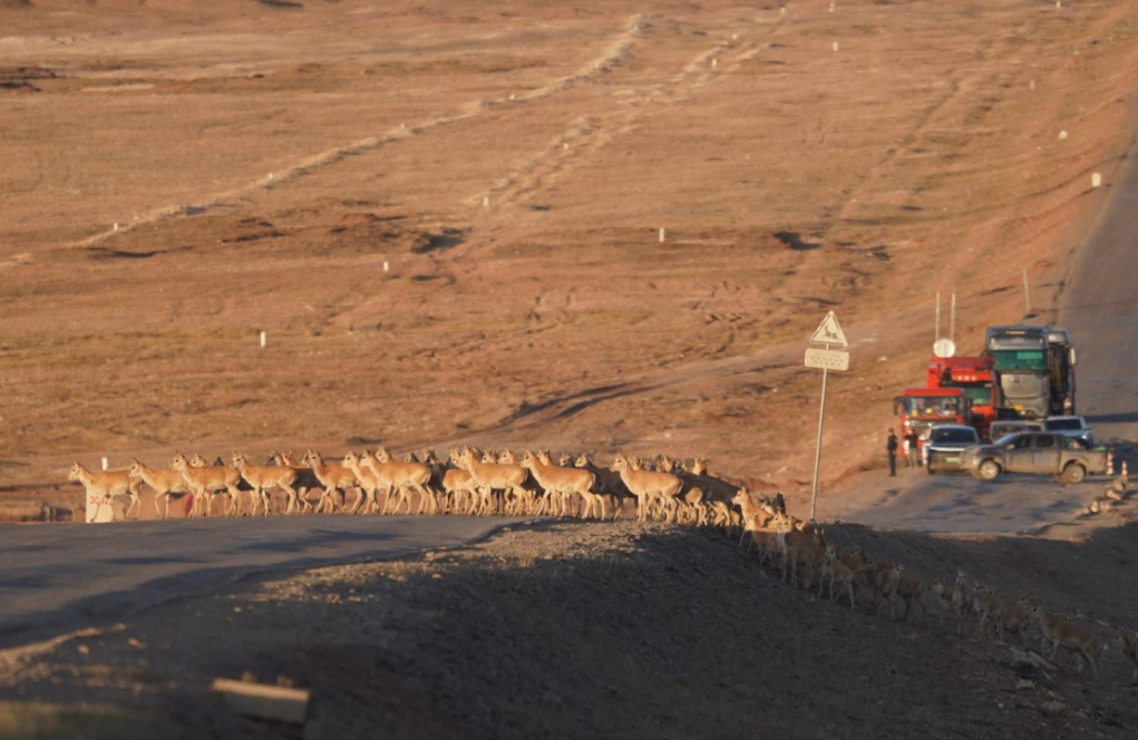 繁忙的公路突然“靜音”,遠(yuǎn)處車流、人群安靜等待,幾只藏羚羊緩慢踏上公路,頭羊反復(fù)“試探”確認(rèn)安全后,羊群再迅速穿過公路。