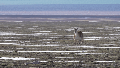 正在埋頭吃草的藏羚羊顯然對這只新來的“伙伴”充滿了好奇,紛紛停止覓食,抬起頭來,打量著這個有點不一樣的“新人”。很明顯,機警膽小的藏羚羊只是有點好奇,“新人”的“妝感”并沒有把它們嚇跑。終于,這只有點特殊的“藏羚羊”成功入群,成為卓乃湖畔成千上萬只藏羚羊中的一員。