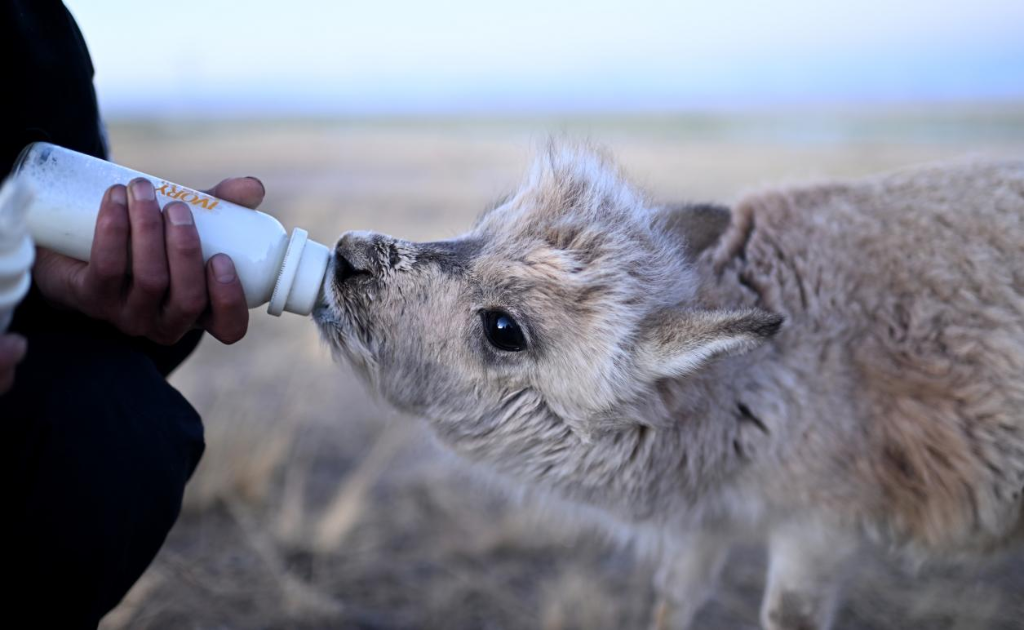 巡山隊(duì)員在可可西里卓乃湖保護(hù)站給救助的小藏羚羊喂奶。新華社記者 杜笑微 攝
