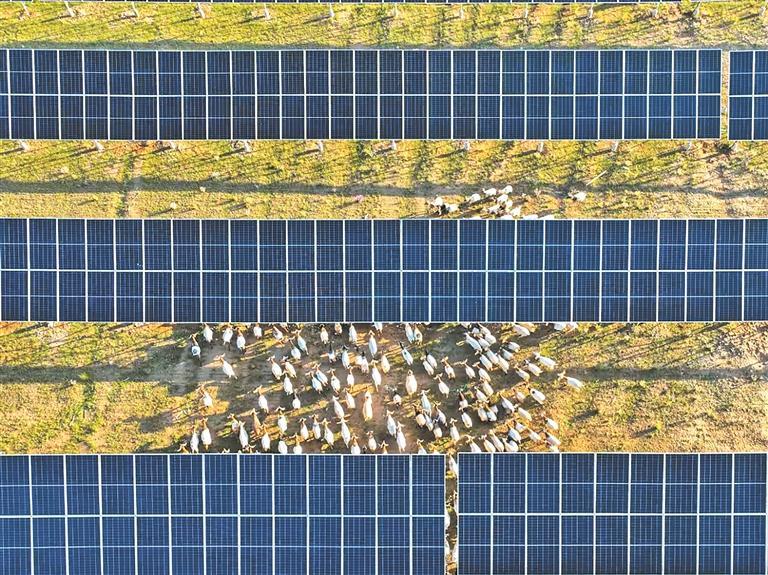 電站的建成和發(fā)展也在回報著他們。十幾年來,光伏園區(qū)不僅給當?shù)厝罕娞峁┝藙展C會,還為他們提供了獨特的畜牧方式——光伏板下和光伏板之間的草比別處更為茂盛,村民的羊群在這里覓食,“光伏羊”長得格外肥壯。在園區(qū)和村民們的努力下,當?shù)氐木G色逐年增多,塔拉灘人的家園欣欣向榮。