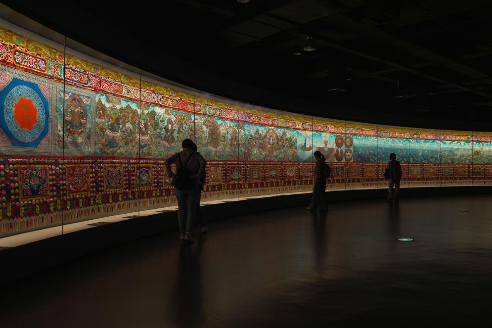 沿著展廳緩緩前行,最令人震撼的莫過于《中國(guó)藏族文化藝術(shù)彩繪大觀》。講解員溫得兄停在一幅描繪神話傳說的畫面前介紹:“這幅作品由青、藏、甘、川、滇五省區(qū)400位唐卡畫師共同完成,僅上卷創(chuàng)作就歷時(shí)27年?!苯衲?月,全長(zhǎng)410米的彩繪大觀下卷布展完成,目前正在博物館北館特展展出。