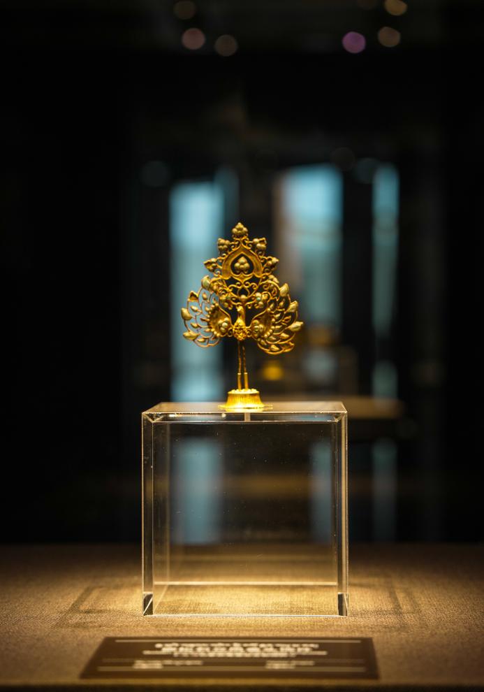 走進(jìn)絲綢之路與青藏高原文明展廳,一件嵌松石立鳳金頭飾靜靜陳列在展柜中,金片捶揲而成的鳳凰羽翼豐滿,鳳凰展翅昂立的姿態(tài)吸引著游客紛紛駐足拍照。這件來自吐蕃時(shí)期的珍貴文物,以精湛的工藝成為博物館最受歡迎的展品之一。正是這件精美頭飾,去年作為“文化使者”遠(yuǎn)赴法國(guó),在唐代主題文物展中向歐洲觀眾展示了青藏高原的璀璨文明。