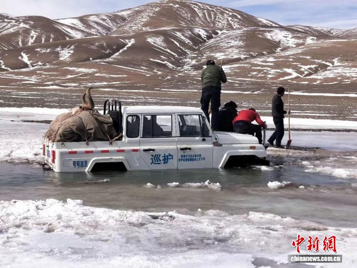 資料圖為巡護(hù)車輛陷入冰窟。受訪者供圖