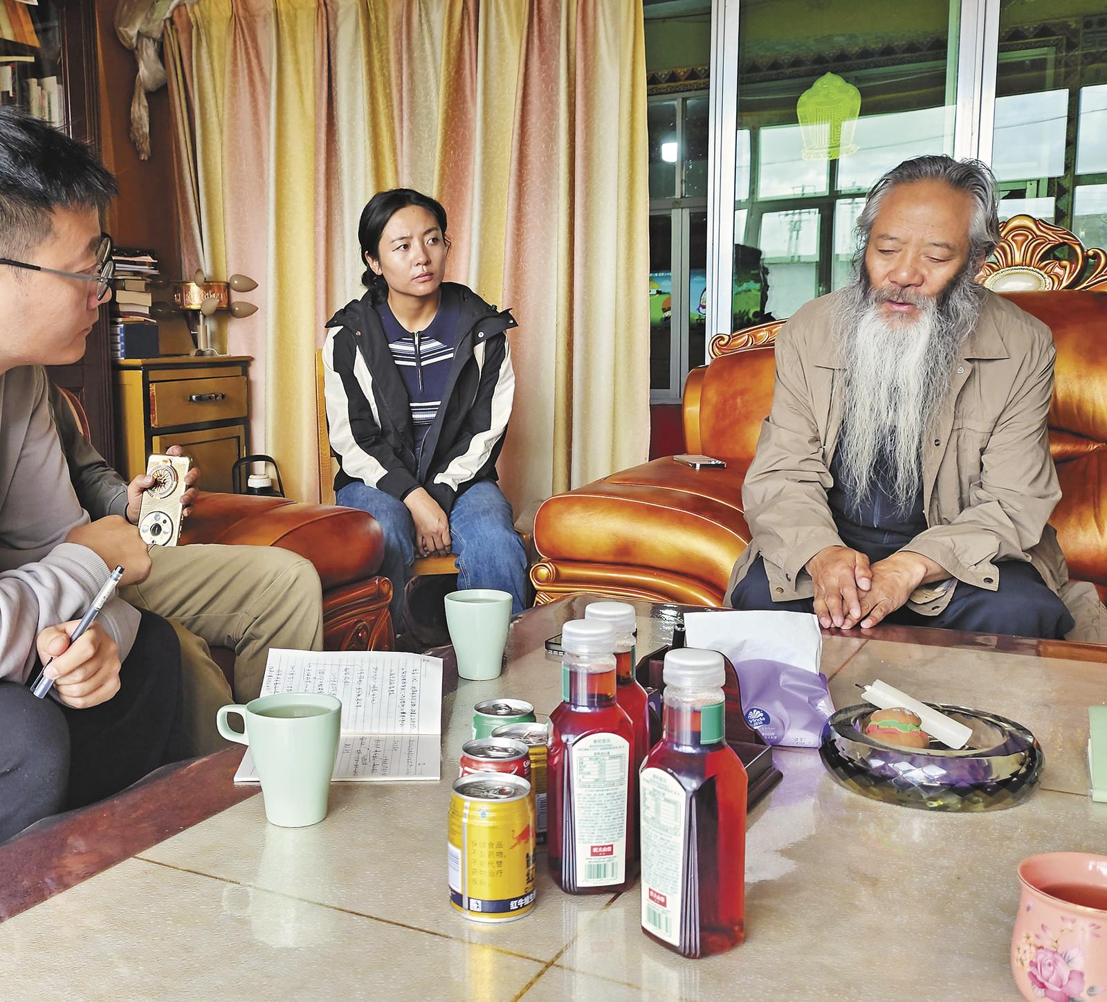 文才家住青海省玉樹藏族自治州治多縣文化館附近,走進院子,陽光灑在修剪整齊的草坪上,中央那一頂帳篷格外醒目。“歡迎來我家做客,老師們請坐,我給你們倒茶。”文才熱情地迎了上來。他用流利的普通話與我們交流,長長的白胡子和睿智的眼神,散發(fā)著文人氣息。