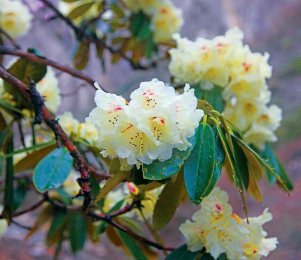 小葉杜鵑則要小一些,其高度不足一米,基本上與人腰齊高。在勒布溝內(nèi),小葉杜鵑主要分布在百花灘附近,也是顏色最為豐富的杜鵑花品種。高山杜鵑則分布在海拔4000米以上,相較于前兩個(gè)品種,其姿態(tài)要小得多,如同灌木叢。