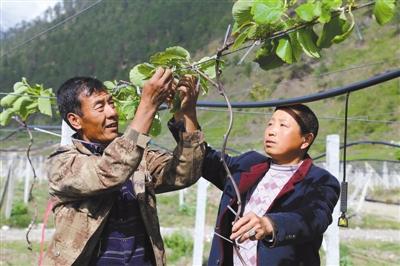 擁珍拉姆指向的,正是布巴村獼猴桃種植基地。已是下午3點,驕陽似火般照射大地。記者手中的相機被曬得發(fā)燙,但滿目所見,都是一派忙碌景象,只見村民們提著小桶為一棵棵嫩綠的獼猴桃樹苗施放水溶性生根劑,幫助新樹把根系牢牢扎進(jìn)土壤,這也是布巴村產(chǎn)業(yè)脫貧的“根基”所在。