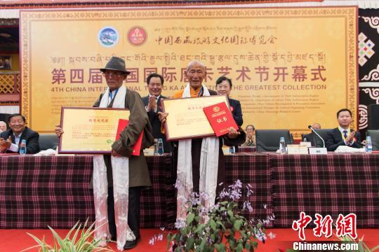 開幕式上西藏文化發(fā)展促進(jìn)會(huì)授予國家級(jí)非物質(zhì)文化遺產(chǎn)唐卡藝術(shù)代表性傳承人丹巴繞旦、嘎瑪?shù)吕?位唐卡藝術(shù)大師“終身成就獎(jiǎng)”。 何蓬磊 攝
