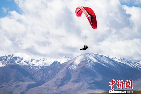 圖為滑翔傘運動員在羊八井高山訓(xùn)練基地附近進(jìn)行滑翔表演。 何蓬磊 攝