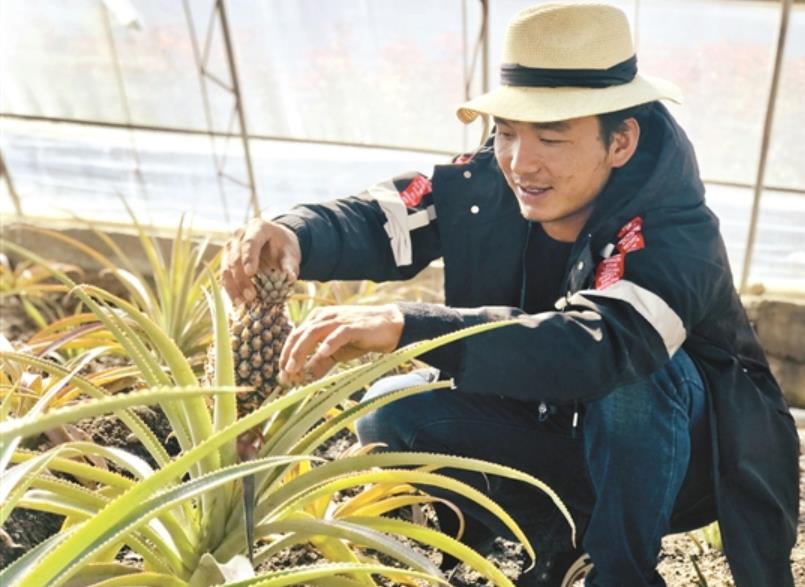 近年來,西藏拉薩曲水凈土健康產(chǎn)業(yè)園加大科技投入,積極引進新產(chǎn)品試驗試種,調(diào)整種植結構,拓寬群眾增收渠道。圖為工作人員展示園區(qū)新試種的菠蘿。記者 凃瓊攝