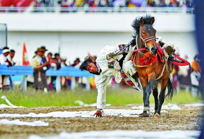 8月10日,2020年那曲羌塘恰青格薩爾賽馬藝術(shù)節(jié)在西藏那曲市格薩爾賽馬場(chǎng)開幕。圖為騎手在藝術(shù)節(jié)開幕式上表演騎馬撿哈達(dá)。新華社記者 張汝鋒 攝