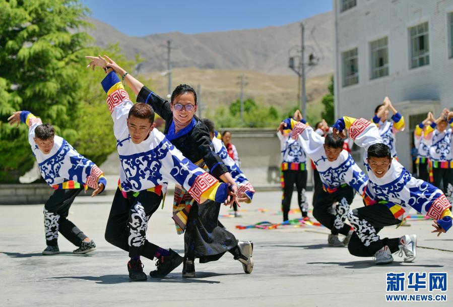 5月8日,在西藏山南市第一高級中學(xué),來自湖北省武漢市旅游學(xué)校的援藏教師馬丹(左三)指導(dǎo)學(xué)生練習(xí)校園啦啦操。新華社記者 張汝鋒 攝
