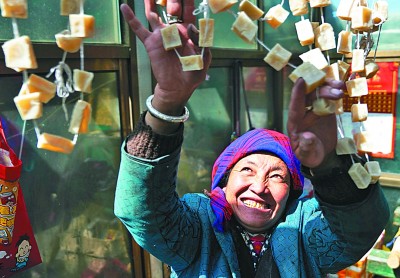 我國(guó)海拔最高鄉(xiāng)——西藏山南市浪卡子縣普瑪江塘鄉(xiāng),牧民生產(chǎn)生活條件得到極大改善。圖為當(dāng)?shù)貗D女在晾曬奶渣。新華社發(fā)