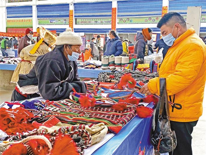 各大展臺上,牛羊肉、奶渣、酥油等農(nóng)畜產(chǎn)品,蟲草、貝母、人參果等中藥材,各具特色的民族手工藝品等,引得人們流連忘返?!拔覀兊难┑匮ナ羌兪止ぶ谱鞯模っ惑w,這里面是羊毛,很暖和,高筒的180元一雙,低筒的150元一雙,擺攤不到一小時,我們已賣出了8雙?!眮碜噪p湖縣嘎措鄉(xiāng)合作社的羅培笑逐顏開。據(jù)羅培介紹,這是他們合作社第6次參加該展銷會,除了賣手工藝品,他們還賣牛羊肉?!爸挥嬎闶止に嚻?,我們每次銷售額都在3萬元左右?!?/p>