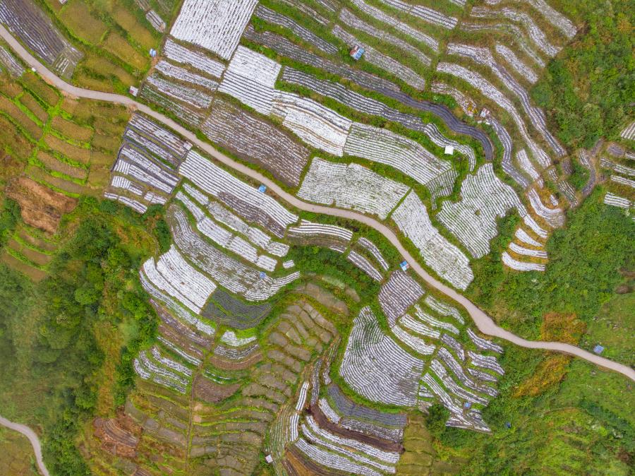 這是穿過西藏墨脫縣郊農(nóng)田的一條農(nóng)村公路(2019年10月26日攝,無人機照片)。新華社記者 孫非 攝
