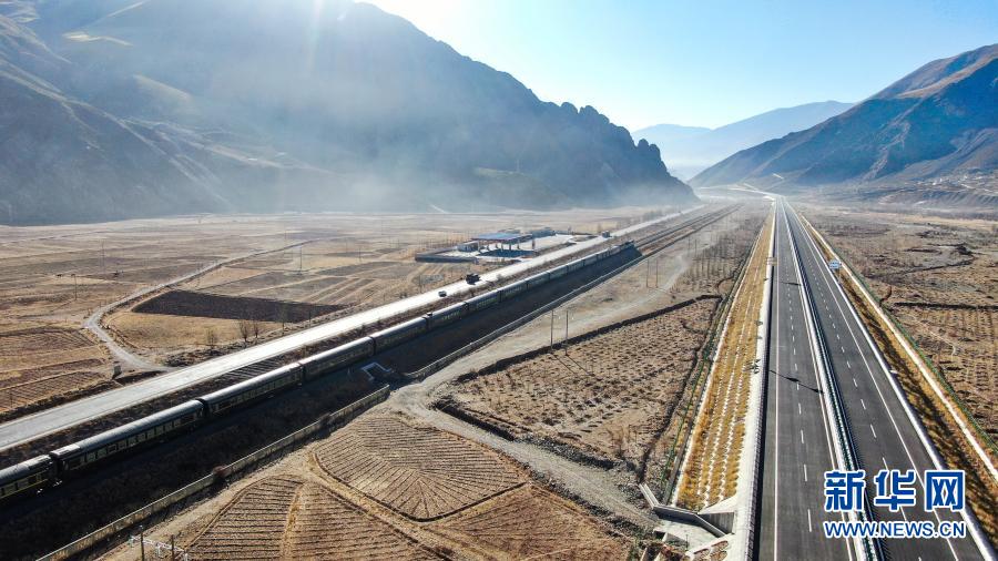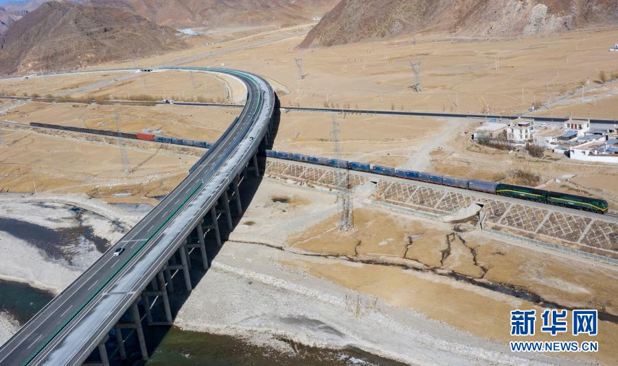 這是拉薩至那曲間的交通線路(1月28日攝,無人機照片)。從左到右依次為109國道、青藏鐵路、高等級公路。新華社記者 孫非 攝