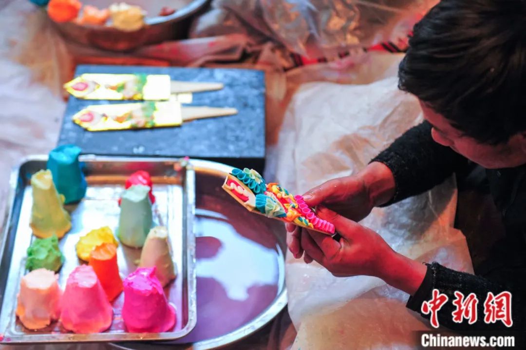 據(jù)悉,“推”是一種用奶渣粉、紅糖、酥油等混合制作的傳統(tǒng)食物,表面畫有“萬”字符,寓意吉祥。