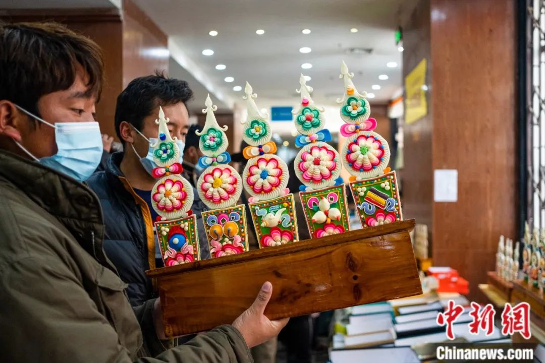 拉薩民眾購買酥油花。何蓬磊 攝