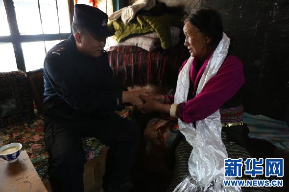 西藏出入境邊檢總站執(zhí)法調(diào)查支隊(duì)四隊(duì)民警在卓瑪老人家中慰問(wèn)(3月4日攝)。新華網(wǎng)發(fā) 羅云川攝