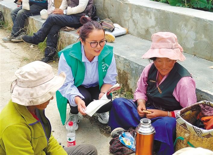 圖為山南市曲松縣駐村工作隊(duì)隊(duì)員(中)向老百姓宣講黨的優(yōu)惠政策